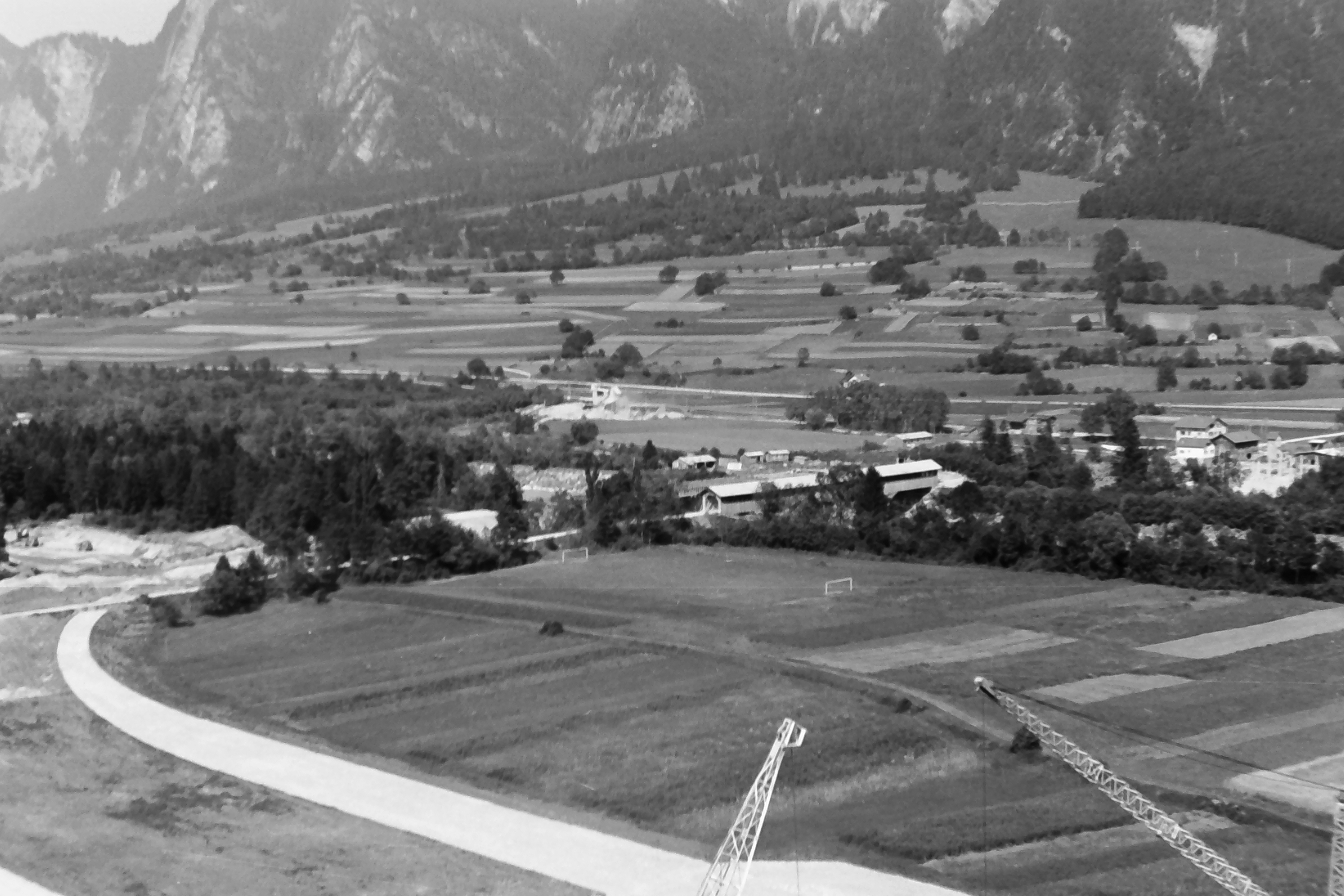 - Blick im Jahre 1957 von der Baustelle des Zementwerkes auf die Flur mit dem Sportplatz