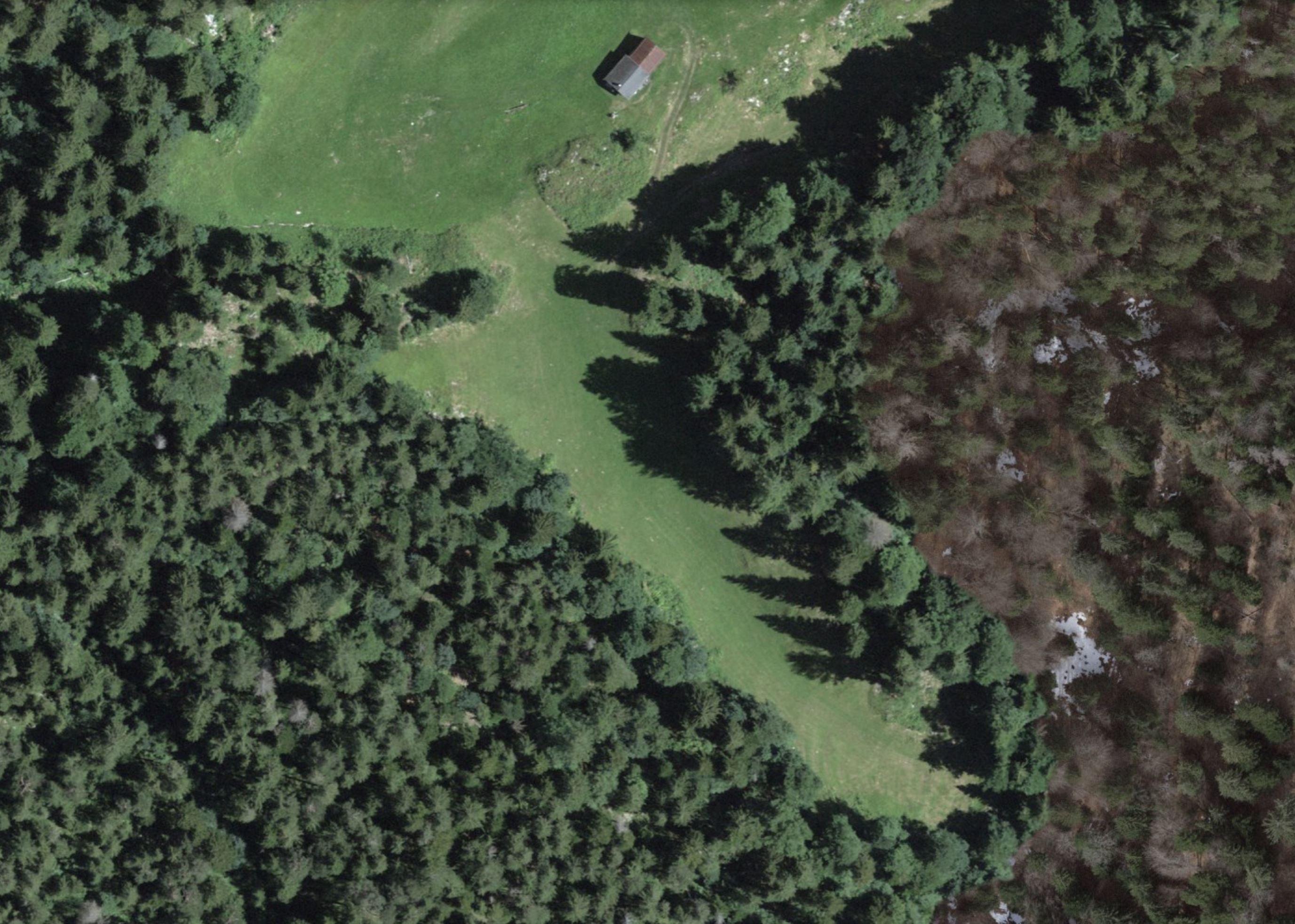 - Ausschnitt aus einem Luftbild mit der, in einer schmalen Talmulde liegenden Bergwiese. Oben im Bild Gebäude auf Gortschna.