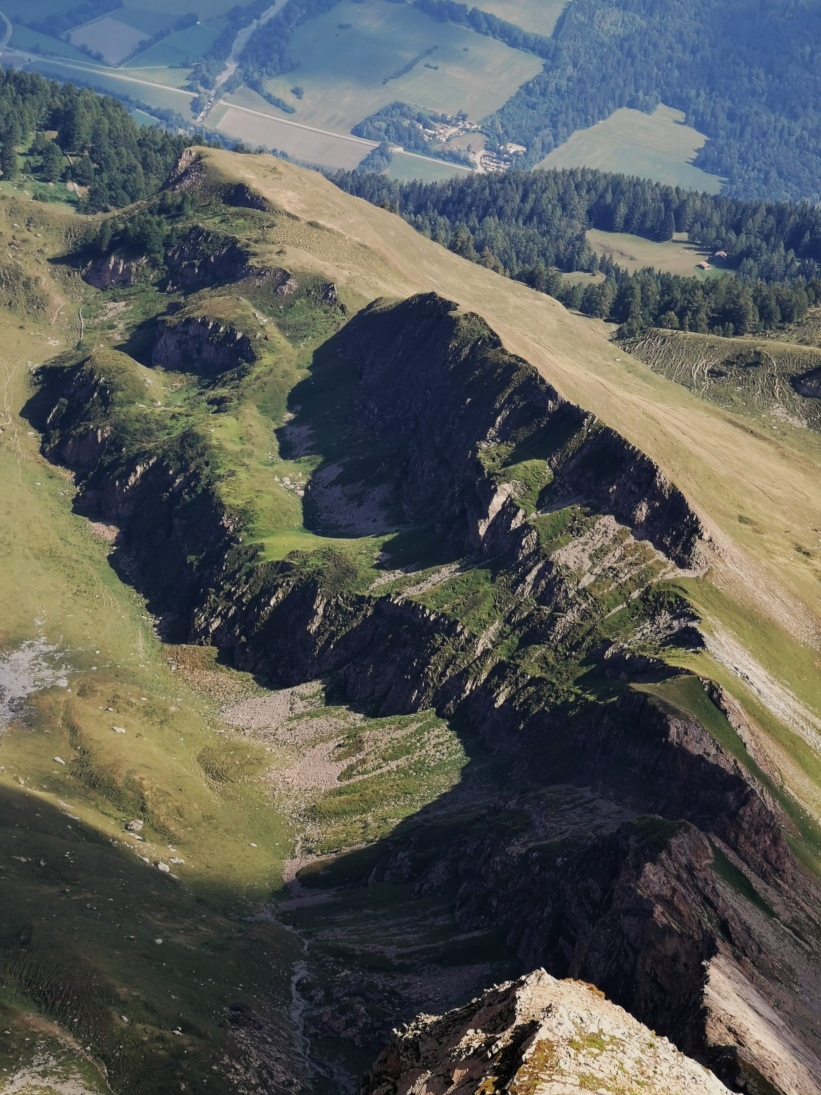- Ausblick vom südwestlichsten Punkt des Vazer Gemeindegebietes (auf ca. 2.756 m) auf dem Südkamm des Haldensteiner Calandas hinab über die Felsrücken und Grate des Hinteralgrates vom Wolfegg (hinten) über den Wolfrücken (mitte) und den Wolfchopf (vorne rechts). Gut zu sehen die Hangmulde des Chuatälis. Links fällt das Gelände ins Hinder Tal ab, rechts zum Cafäraboden, über den Bergkamm verläuft die Gemeindegrenze zwischen Untervaz (links) und Haldenstein (rechts). Oben im Bild das Landgut am Strengli (ca. 590 m, Trimmiser Gebiet) tief unten im Rheintal.