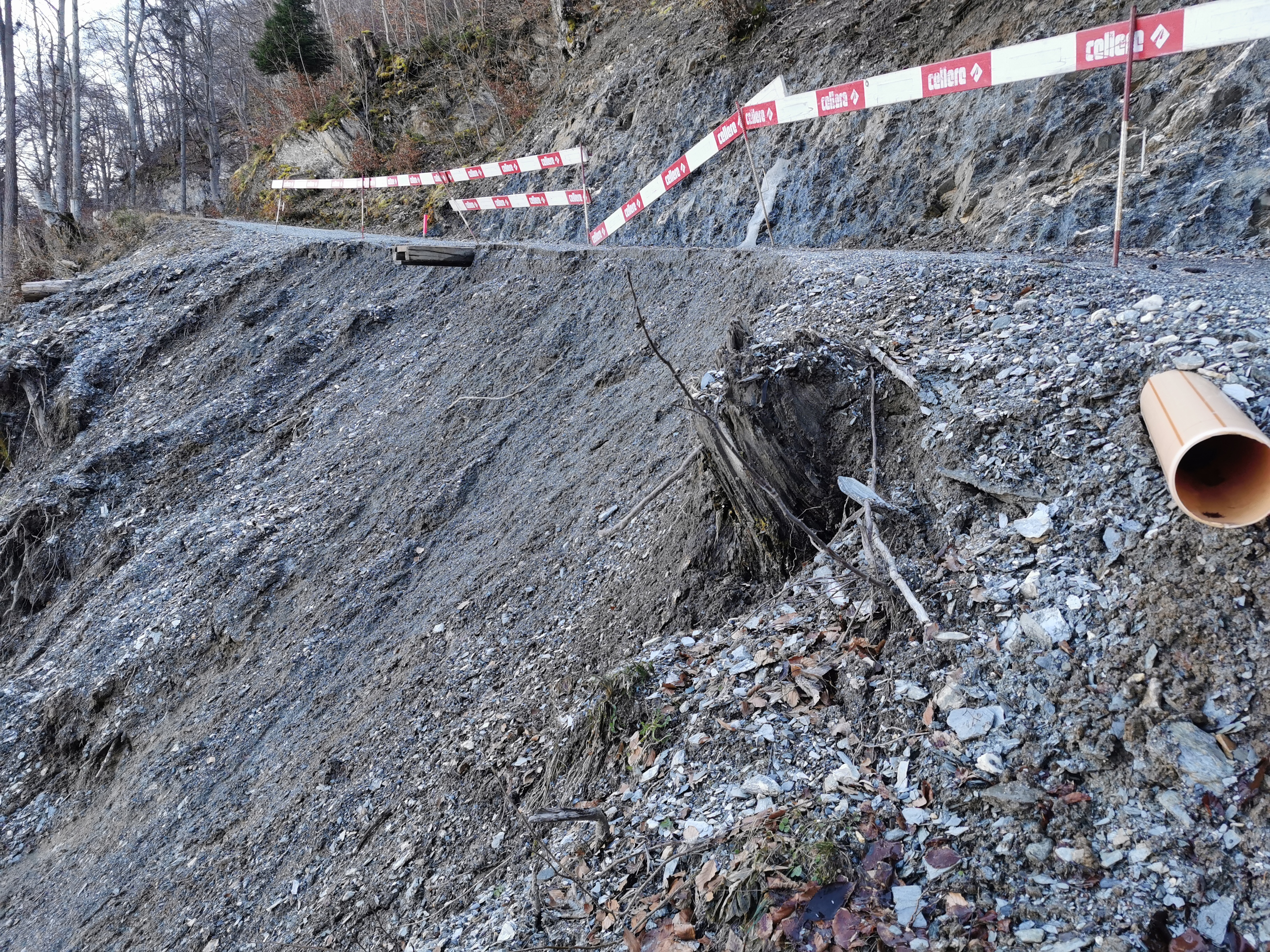 - Abgerutschter Hang am Bös Tritt an der Vazer Alpstrasse auf ca. 881 m Höhe.